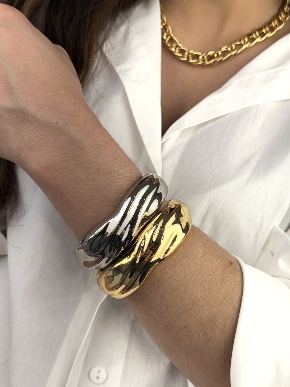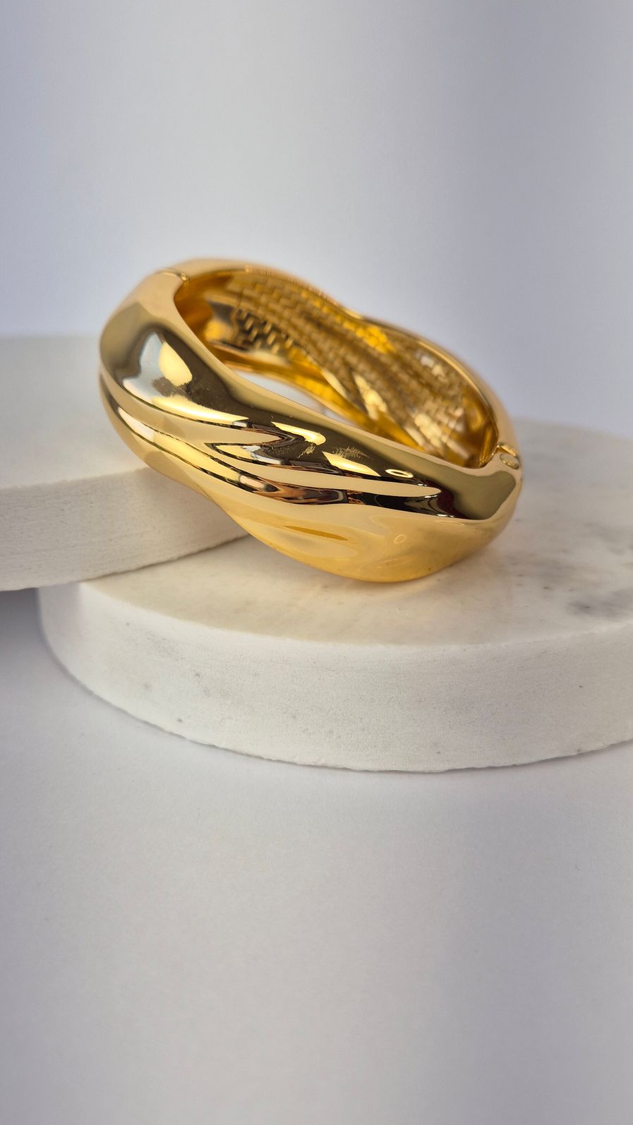 Bracelete dourado robusto com design torcido. Uma peça imponente que transmite sofisticação e estilo, perfeita para transformar qualquer produção em um look de impacto.
