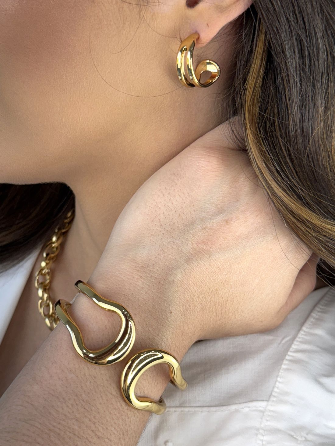 Bracelete dourado com desing moderno e curvas vazadas. Uma peça imponente e sofisticada que traz personalidade ao look.