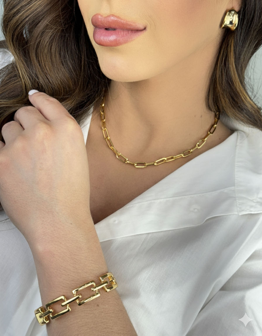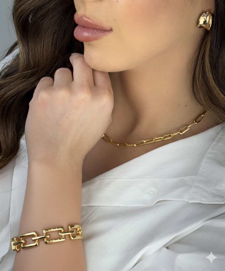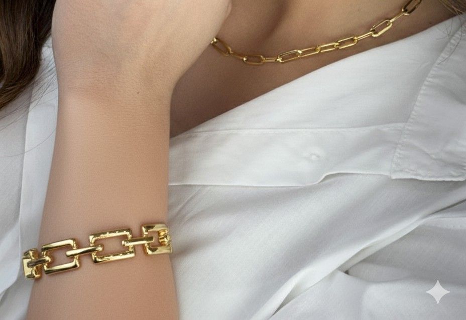 Bracelete dourado com elos geométricos, estruturado e sofisticado. Uma peça imponente que une modernidade e elegância.