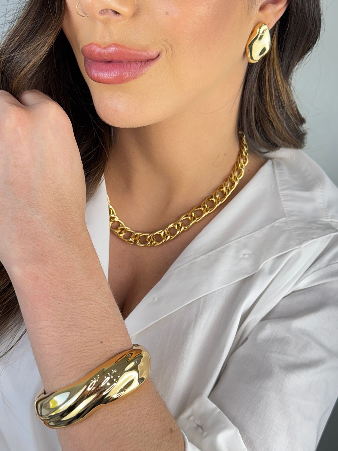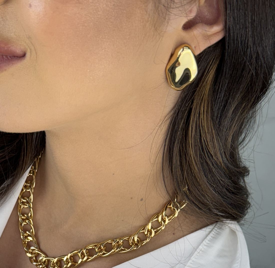 Brinco dourado em forma orgânica. Uma peça moderna e elegante que traz personalidade ao look. Ideal para quem busca um sofisticação e modernidade.