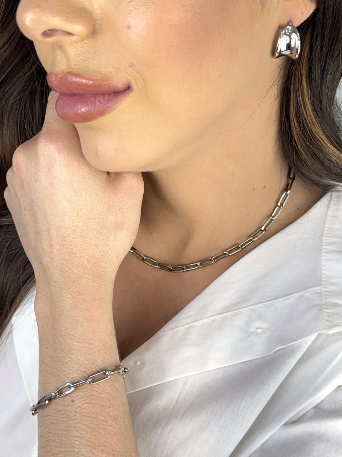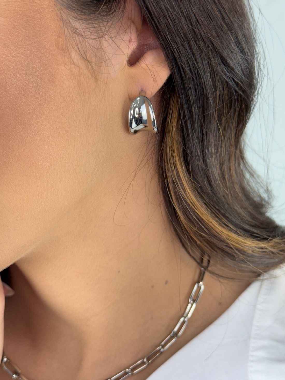 Brincos prateado com design curvado e acabamento elegante. Uma peça versátil que une delicadeza e modernidade, perfeita para complementar produções casuais e elegantes.