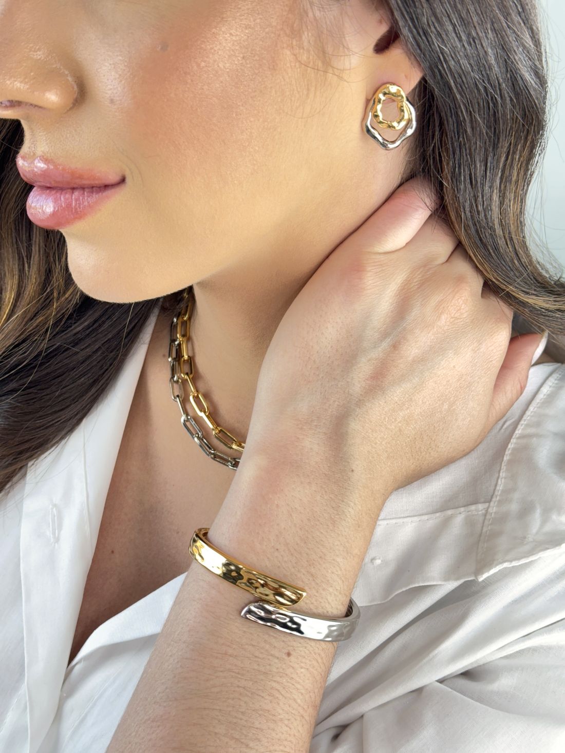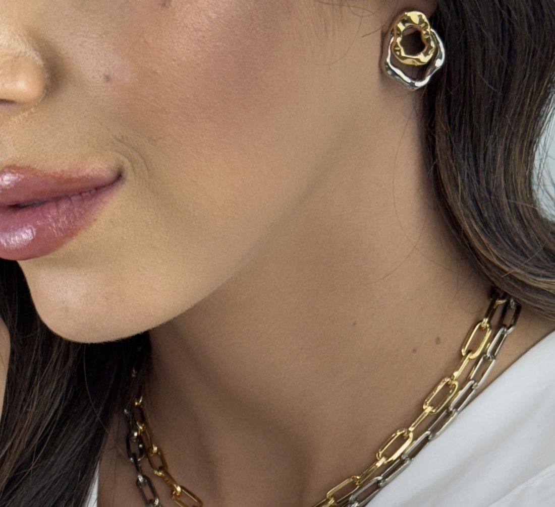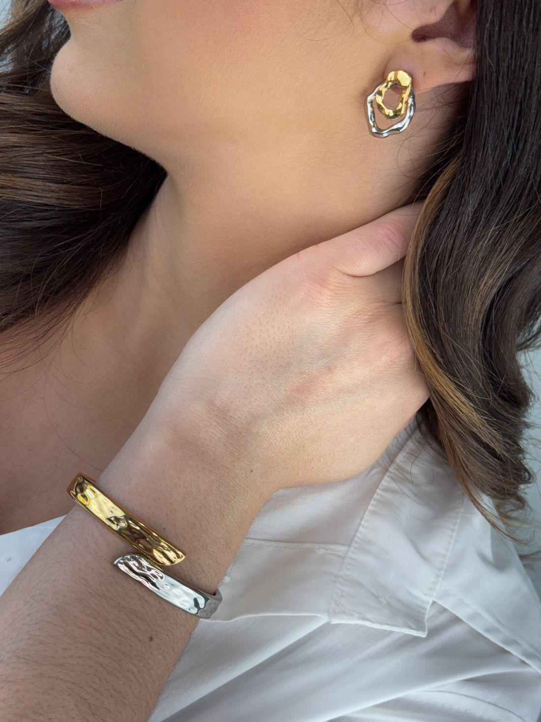 Brinco bicolor com forma orgânica, com o detalhe em prata removível que permite duas formas de uso; apenas a peça dourada para um visual minimalista ou combinado com a parte prata para um look mais moderno e com personalidade.