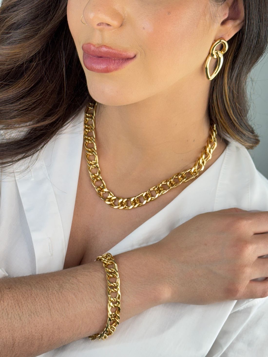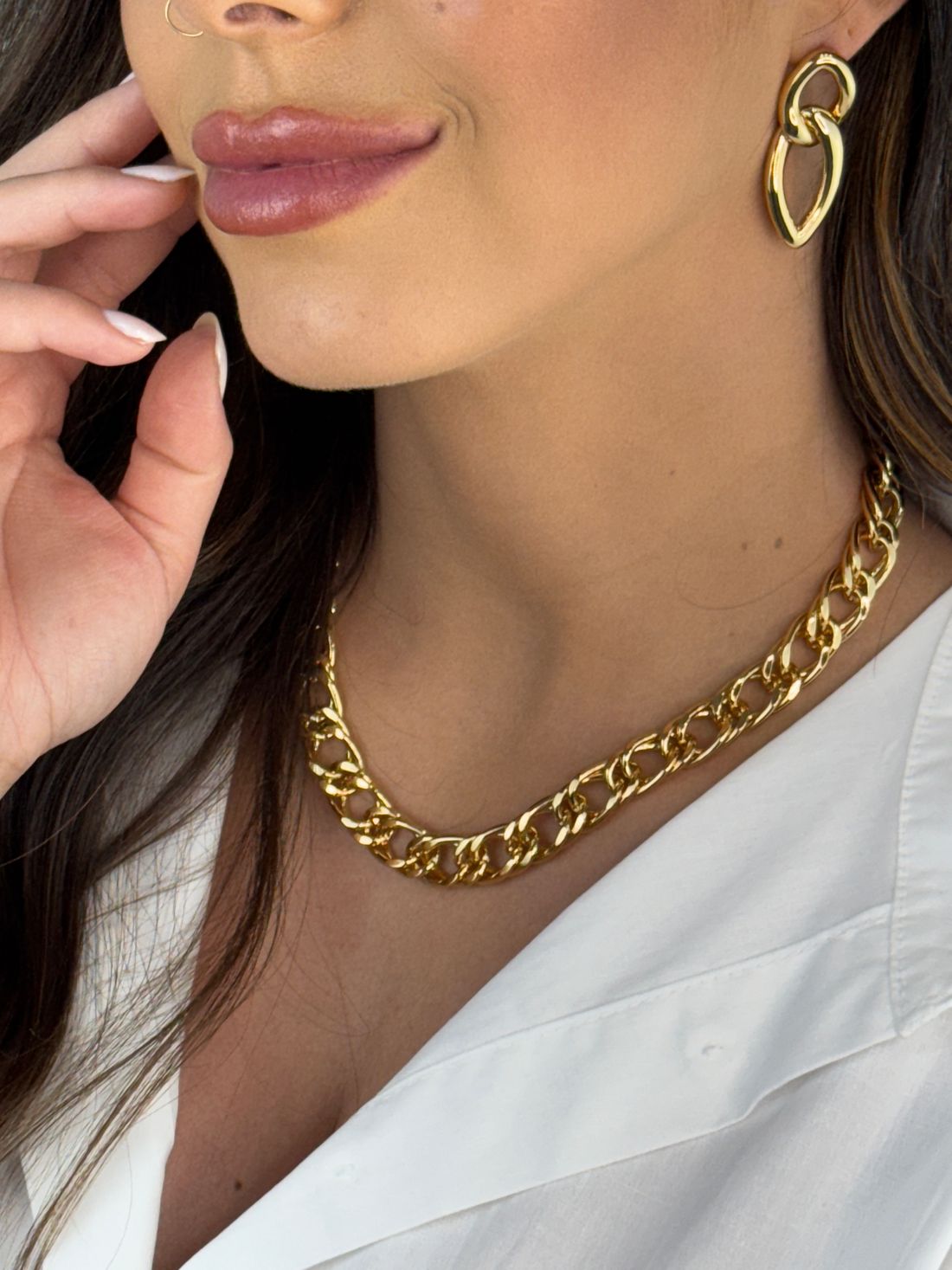 Colar dourado de elos encadeados e design robusto. Ima peça versátil que combina modernidade e estilo, perfeita para compor produções casuais ou dar um toque marcante em looks sofisticados.