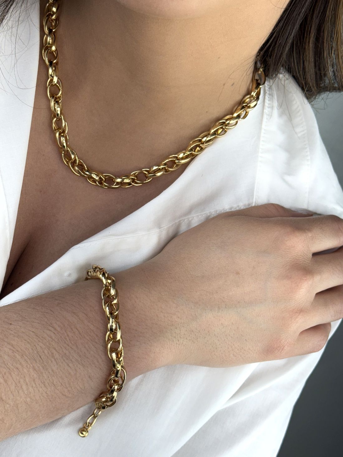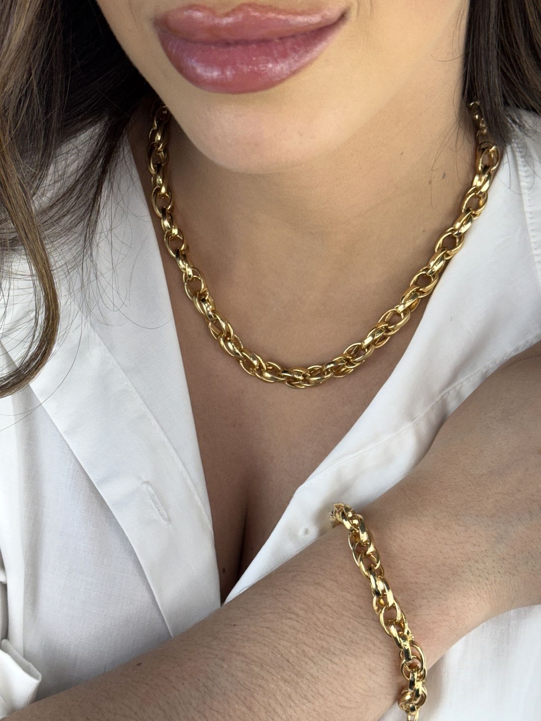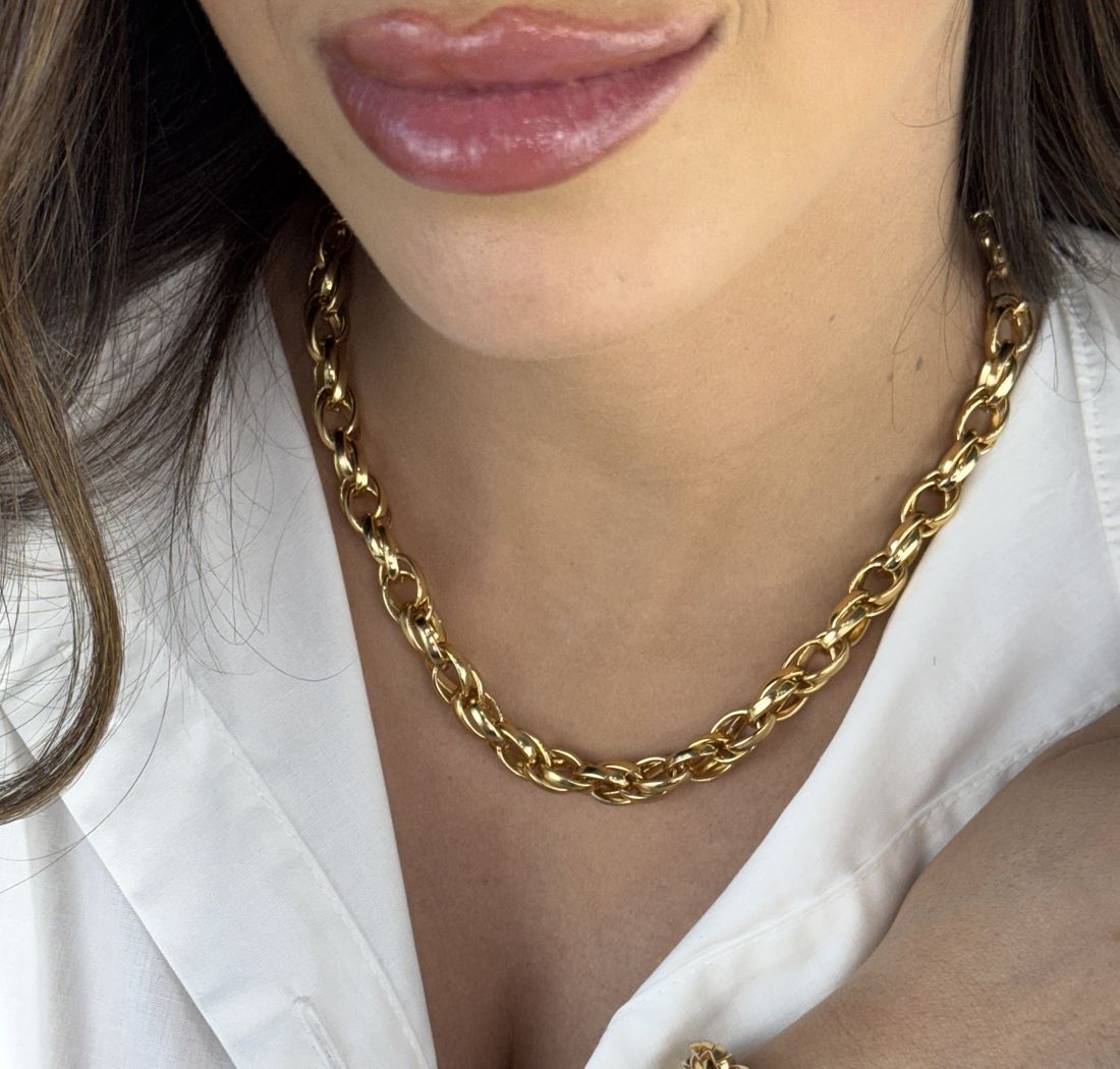 Colar prata moderno de elos médios entrelaçados, com acabamento polido e design atemporal. Uma peça versátil que pode ser usada sozinha para um toque elegante ou combinada em camadas para um visual moderno.