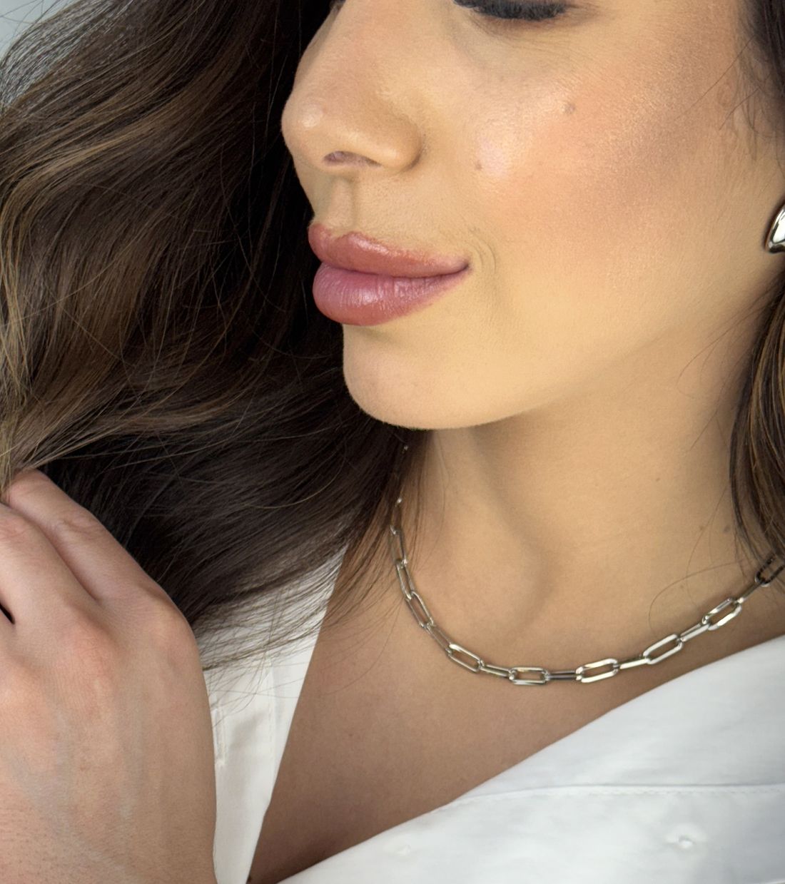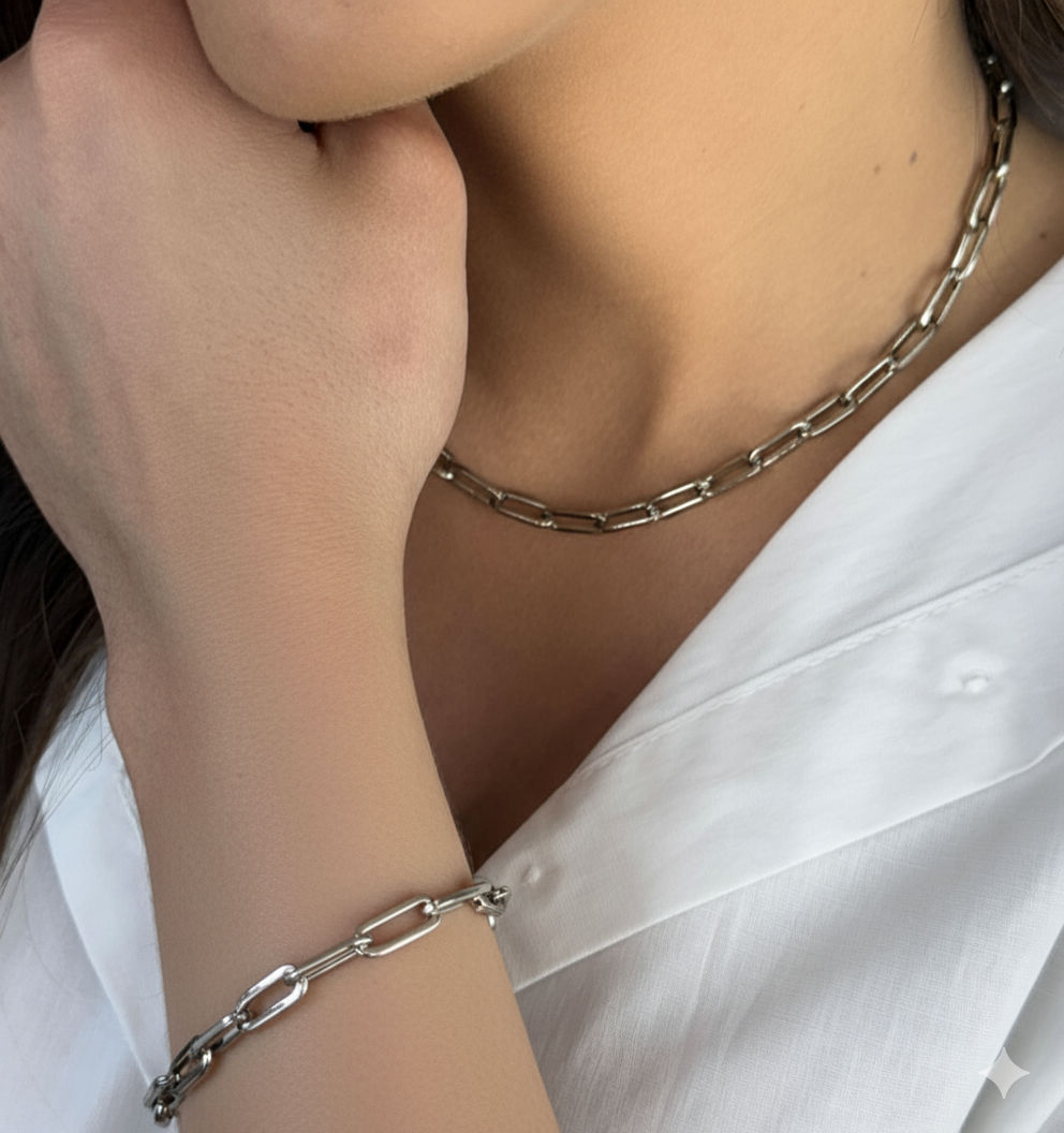 Colar prata com elos mais retangulares, elegante e sofisticada. Versátil que transita entre o clássico e moderno, perfeita para usar sozinha em look mais minimalista ou em composições para looks mais marcantes.