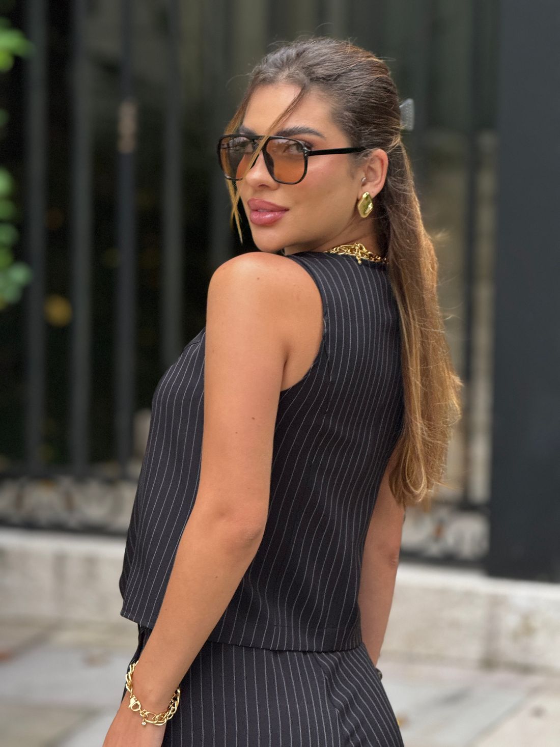 Colete em tecido plano, corte e caimento de alfaiataria, botões de pressão forrados no mesmo tecido, perfeito para se usar sozinho ou como terceira peça.