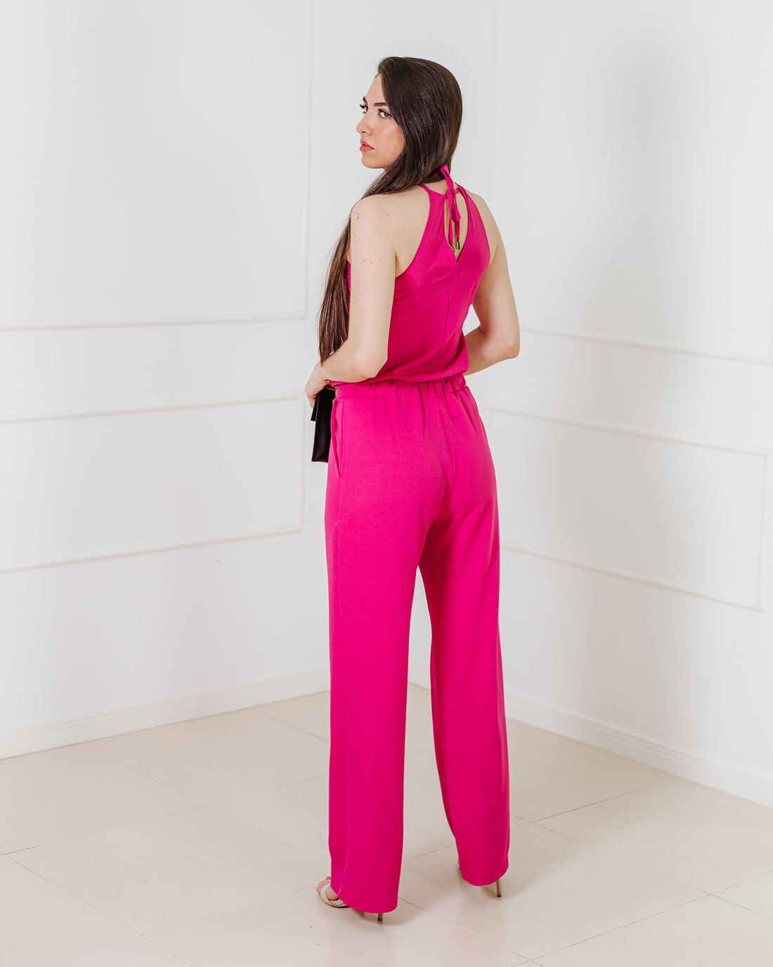 A calça tem um caimento bem fluído, nao possui ziper, sendo de elástico o cós.