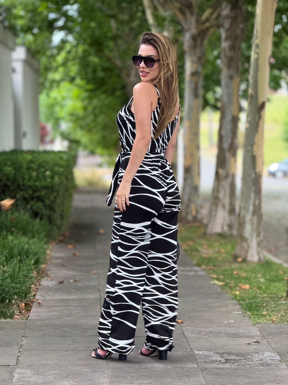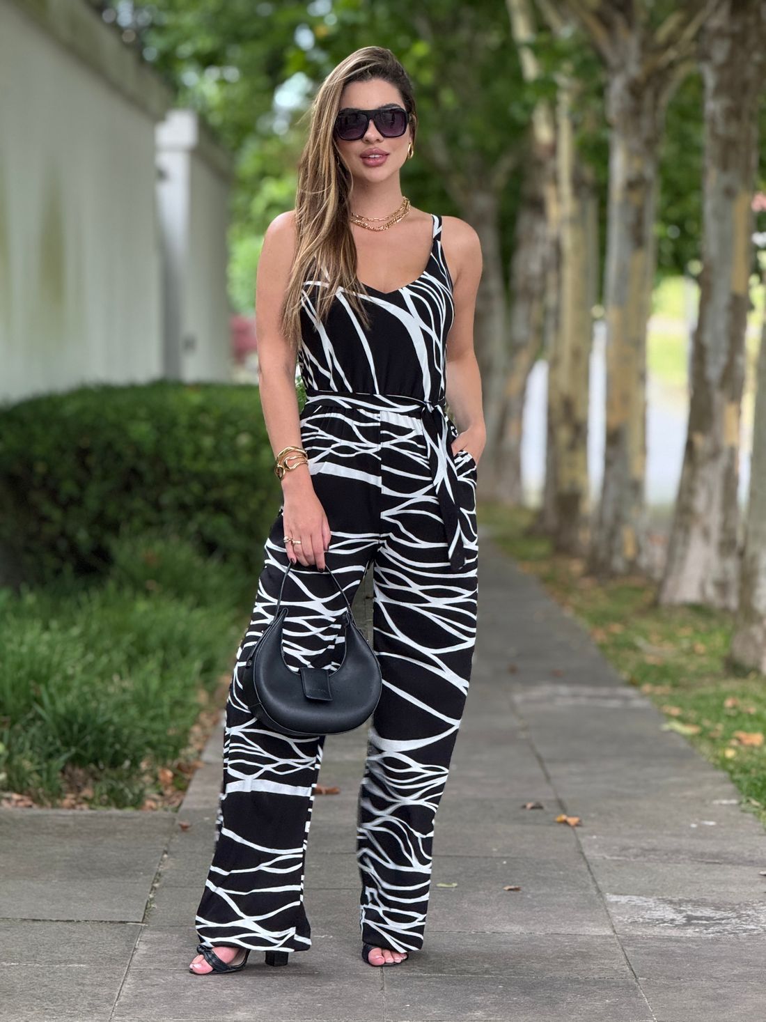 Macacão em tecido leve e fluído com elástico na cintura, regulagem nas alças e bolso lateral, acompanha faixa do mesmo tecido.