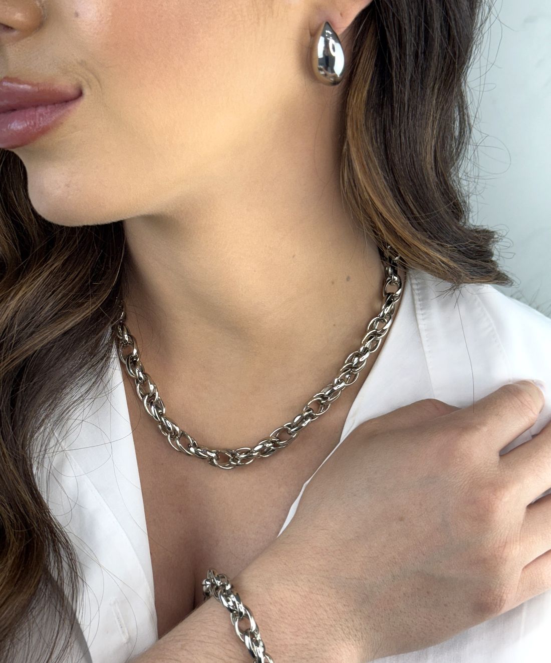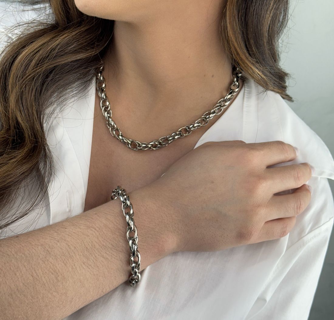 Pulseira prata de elos médios entrelaçados, com acabamento polido e fecho. Um clássico versátil que combina elegância e modernidade, perfeita para usar sozinha ou em um mix com outras pulseiras.