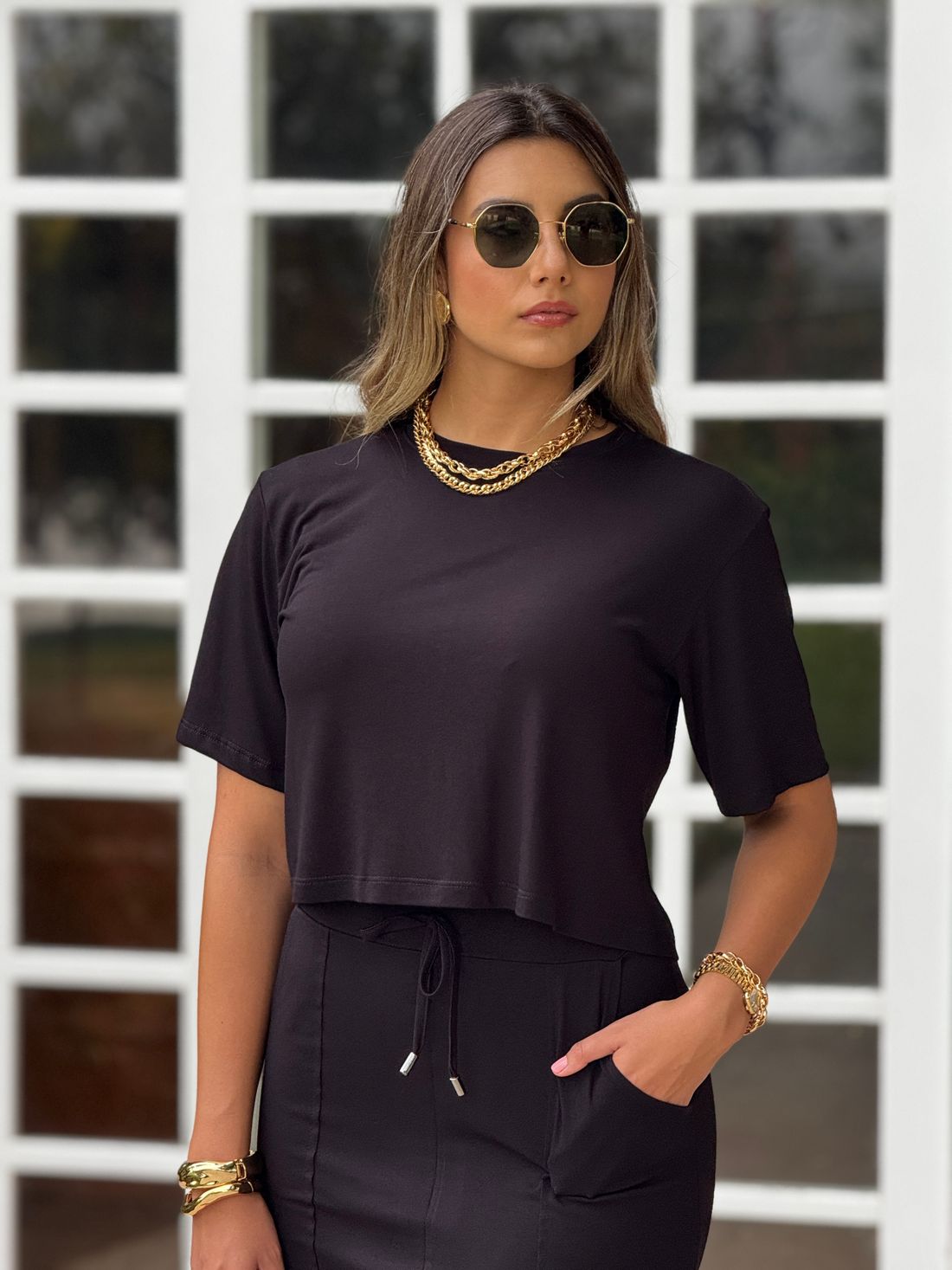 A modelo está vestindo o tamanho P