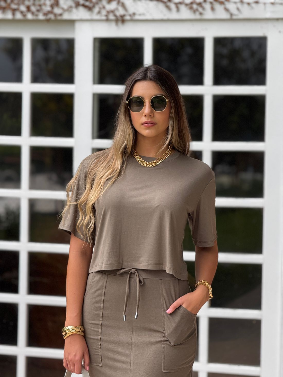 A t-shirt box é um modelo amplo com comprimento na cintura, em viscolycra, uma malha com alta elasticidade, perfeita para criar looks despojados e modernos.