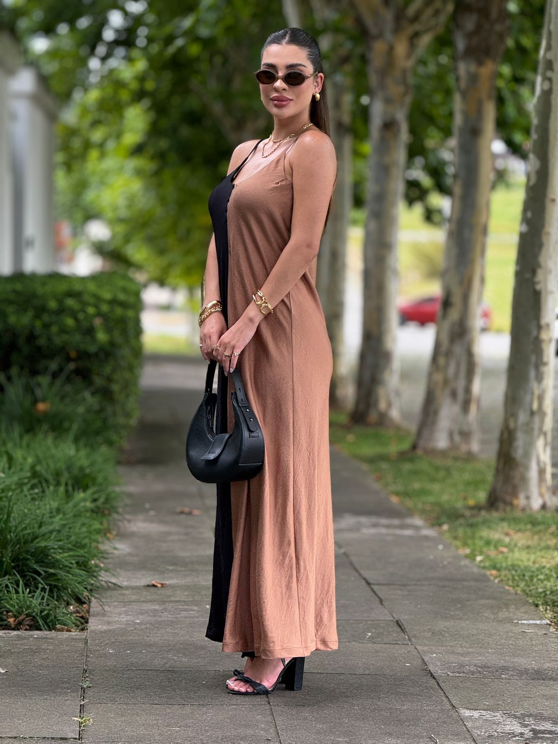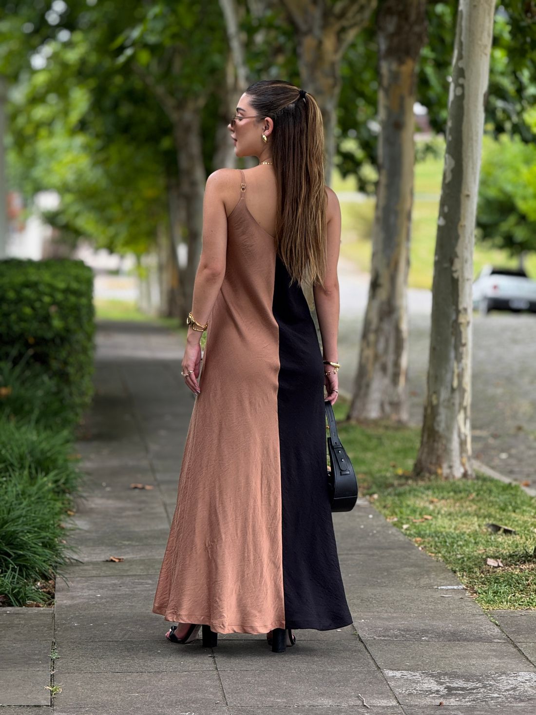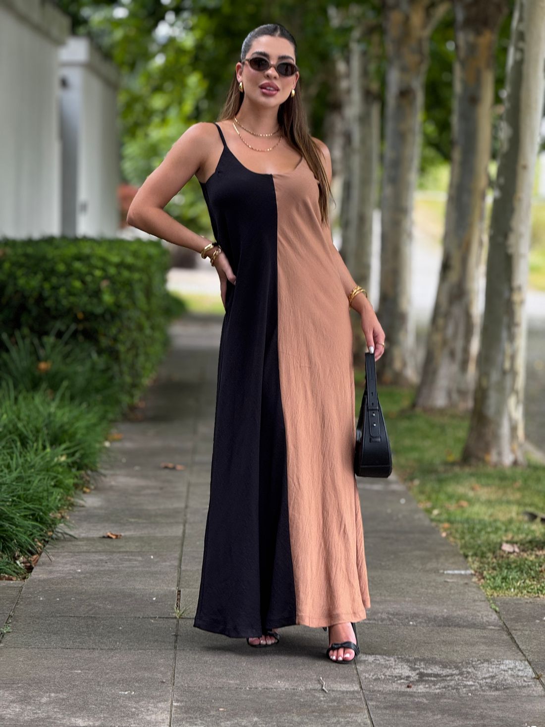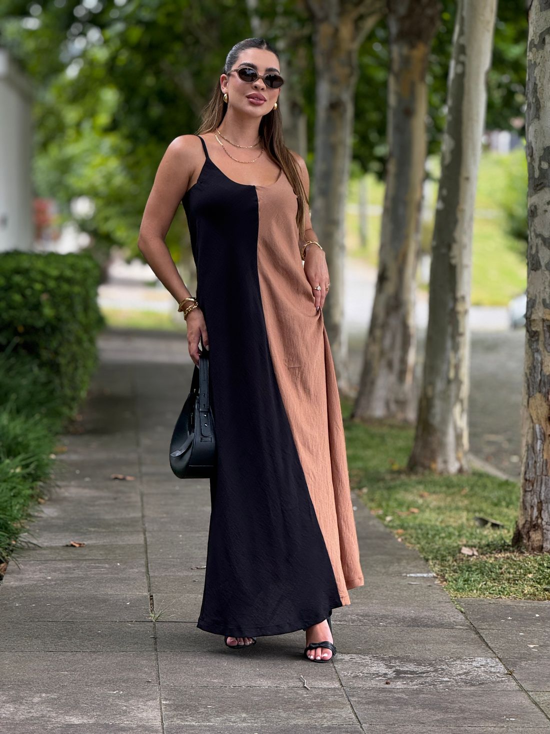 Vestido longo, leve e fluído com regulagem na alça e forro na parte do busto.